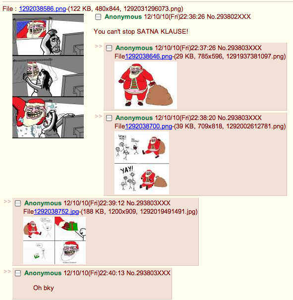 Satna Klause is a Christmas-themed meme which originated off 4chan's /b/ board on December 10th, 2010. It could be considered a variant of trollface, however, with the amount of original content made in a short amount of time, it rightfully deserves to be treated as a separate individual.